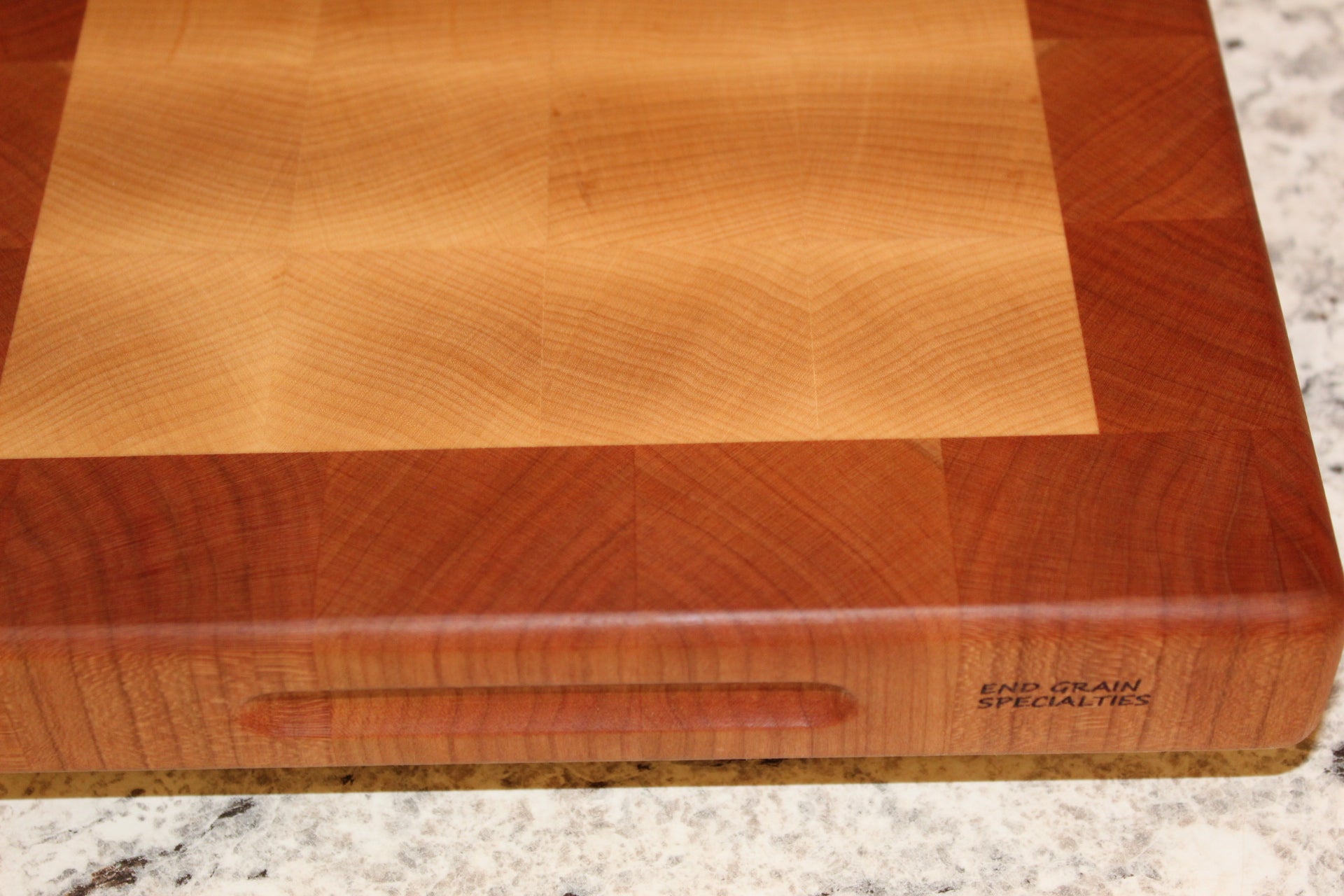 This handcrafted cutting board combines the durability of hard maple with an elegant cherry border, creating both functional beauty and lasting performance. Hard maple's tight grain structure resists knife marks and bacterial growth, making it ideal for food preparation. The contrasting cherry border adds visual sophistication while the natural wood construction develops character with use. Properly maintained, this board will serve your kitchen for years, offering a premium alternative to synthetic surfaces. Perfect for serious cooks who appreciate quality craftsmanship and the warmth of natural wood.